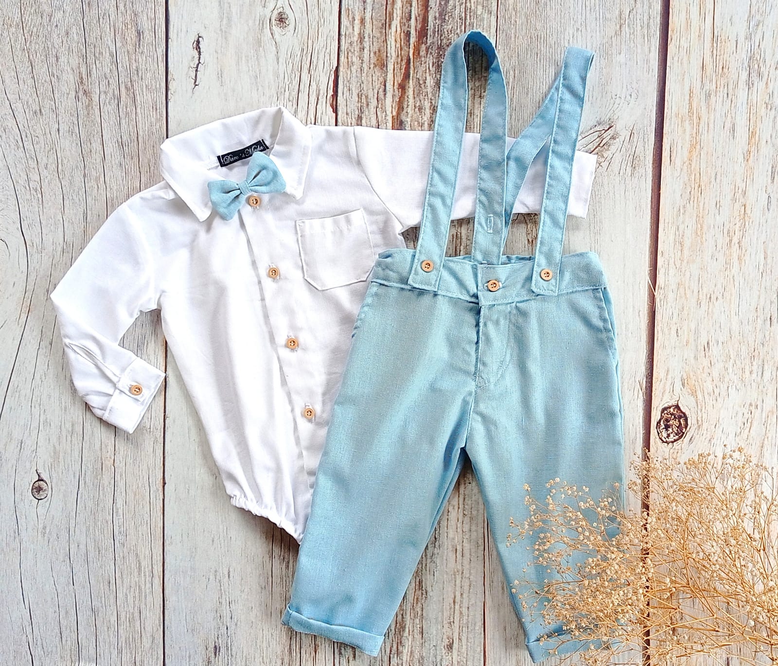 O Look Pietro azul claro é composto por body de manga comprida em linhomisto branco, calça com suspensório e gravata borboleta em linho misto na cor azul claro.