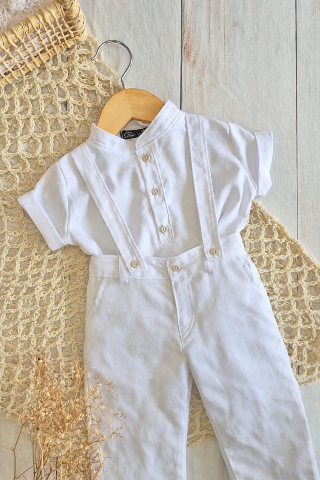 O Look Matteo é composto por camisa de manga curta em linhomisto branco, calça com suspensório em linho misto na cor branca.