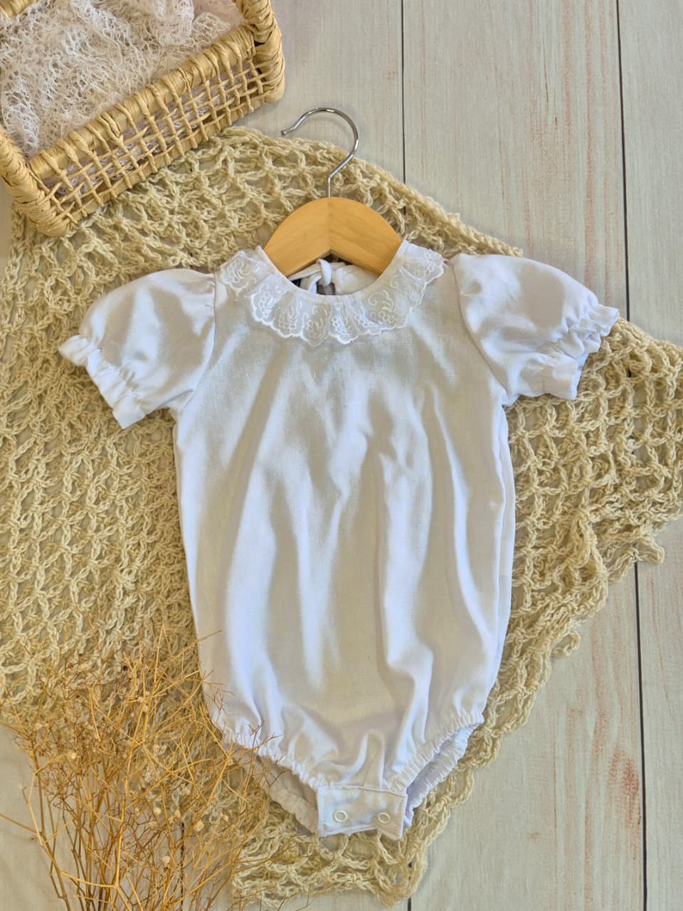 O Body Laura é confeccionada em linho misto, na cor branca com manga curta e detalhe em renda na gola.