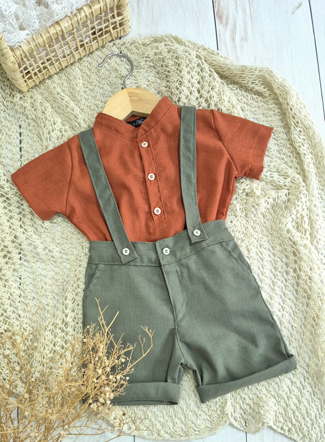 O Look Matteo é composto por camisa em linho misto terracota com manga curta, bermuda e suspensórios em linho misto verde musgo.