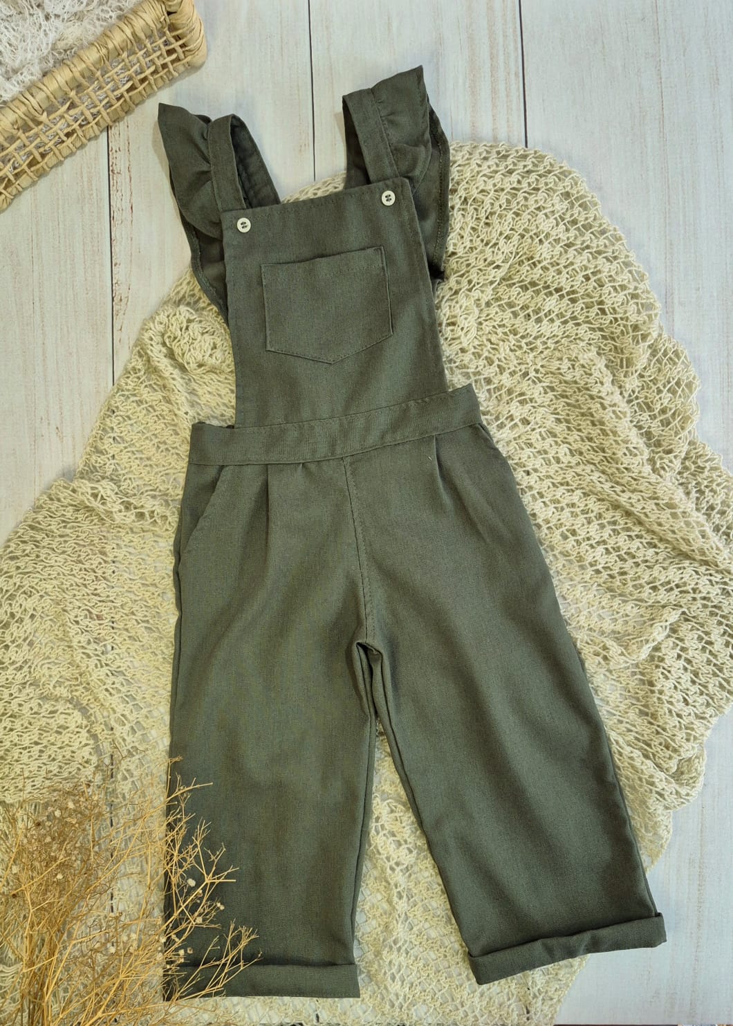 A jardineira Charlotte longa é confeccionada em linho misto verde musgo, com detalhe em babado nas alças.