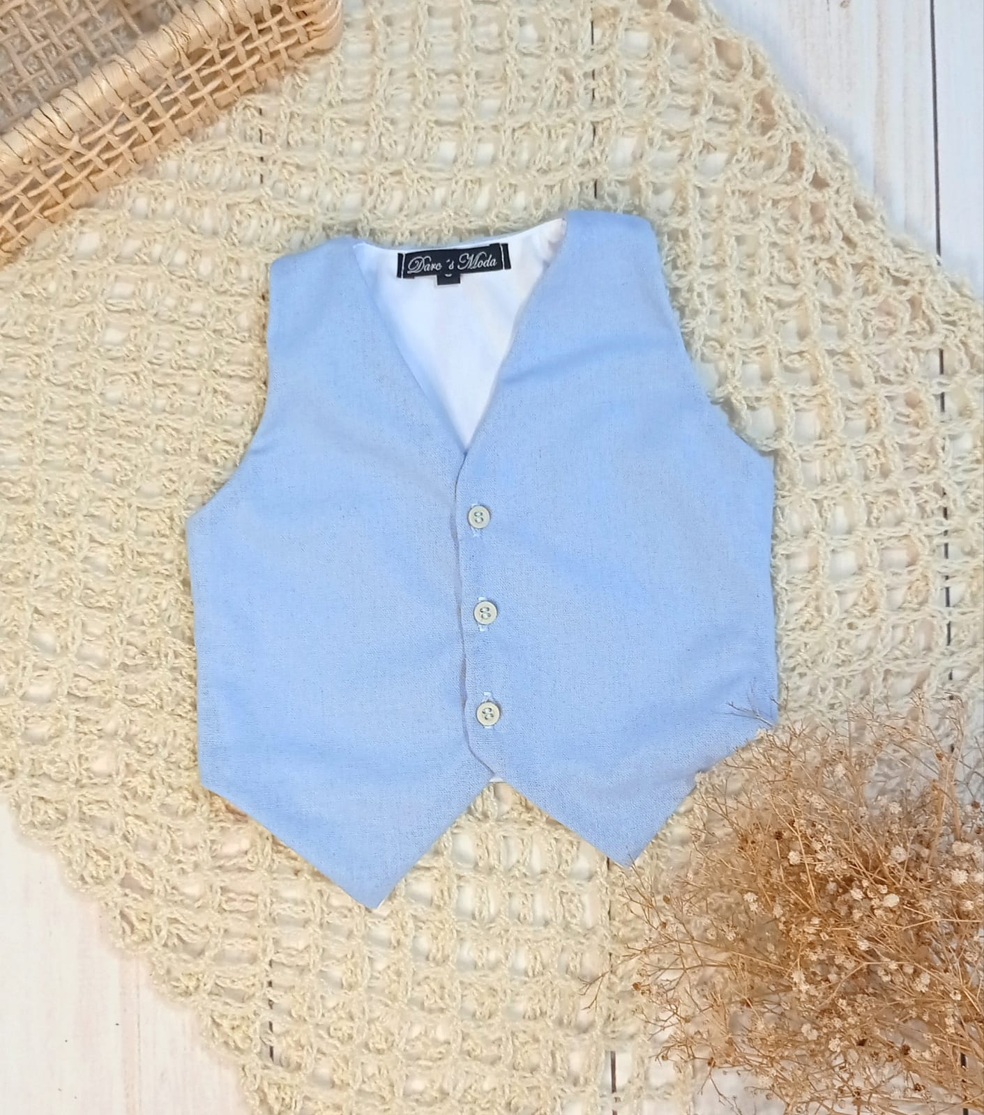 Colete confeccionado em linho azul serenity, com a parte internada forrada e botões bege.