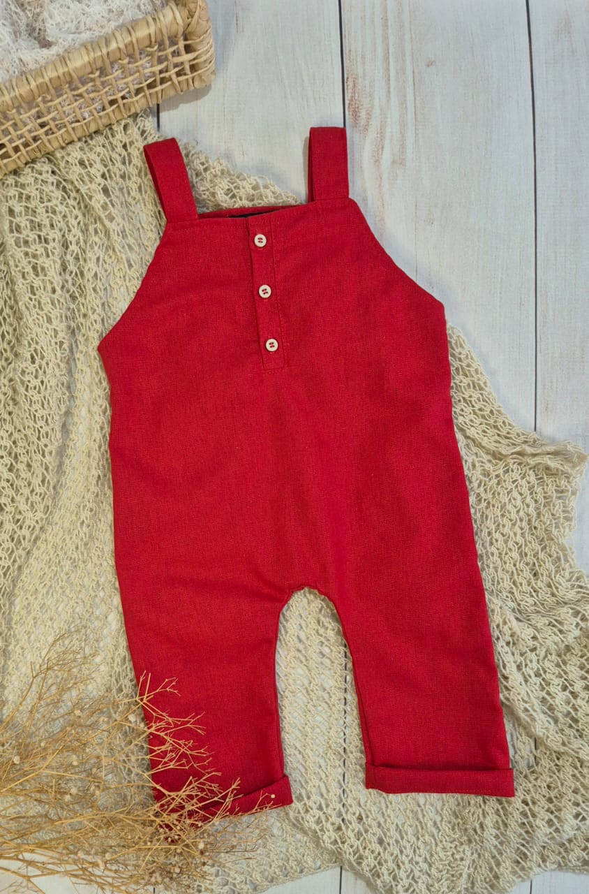 A Jardineira Piere é confeccionada em linho misto vermelho com detalhes em botões na frente.