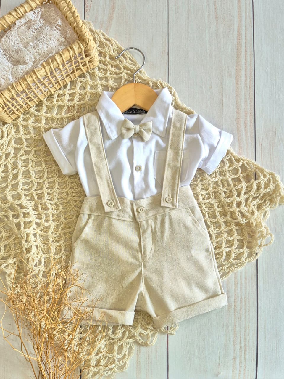 O Look Joaquim é composto por body de manga curta em linho branco, bermuda com suspensório e gravata borboleta em linho na cor natural.