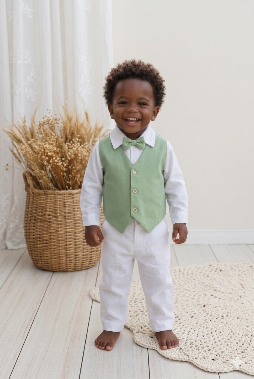 O Look Vicente é composto por body branco de manga longa, calça branca, gravata borboleta e colete em linhoverde menta.