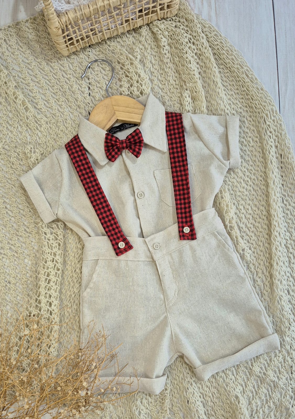 O Look Robert é composto por camisa de manga curta em linho misto natural, bermuda natural, suspensório e gravata borboleta xadrez.