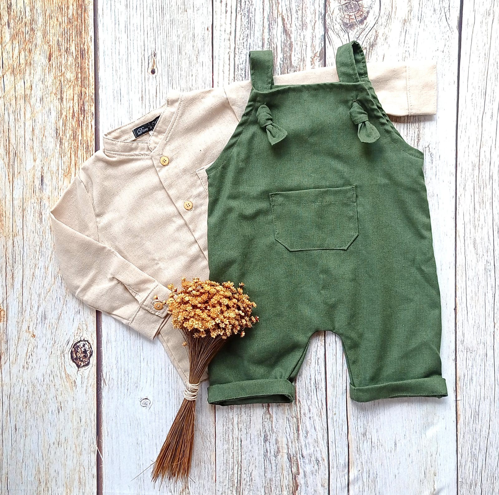 O Look Bento é composto por camisa confeccionada em linho branco de manga longa com gola padre e jardineira curta confeccionado em linho atural.