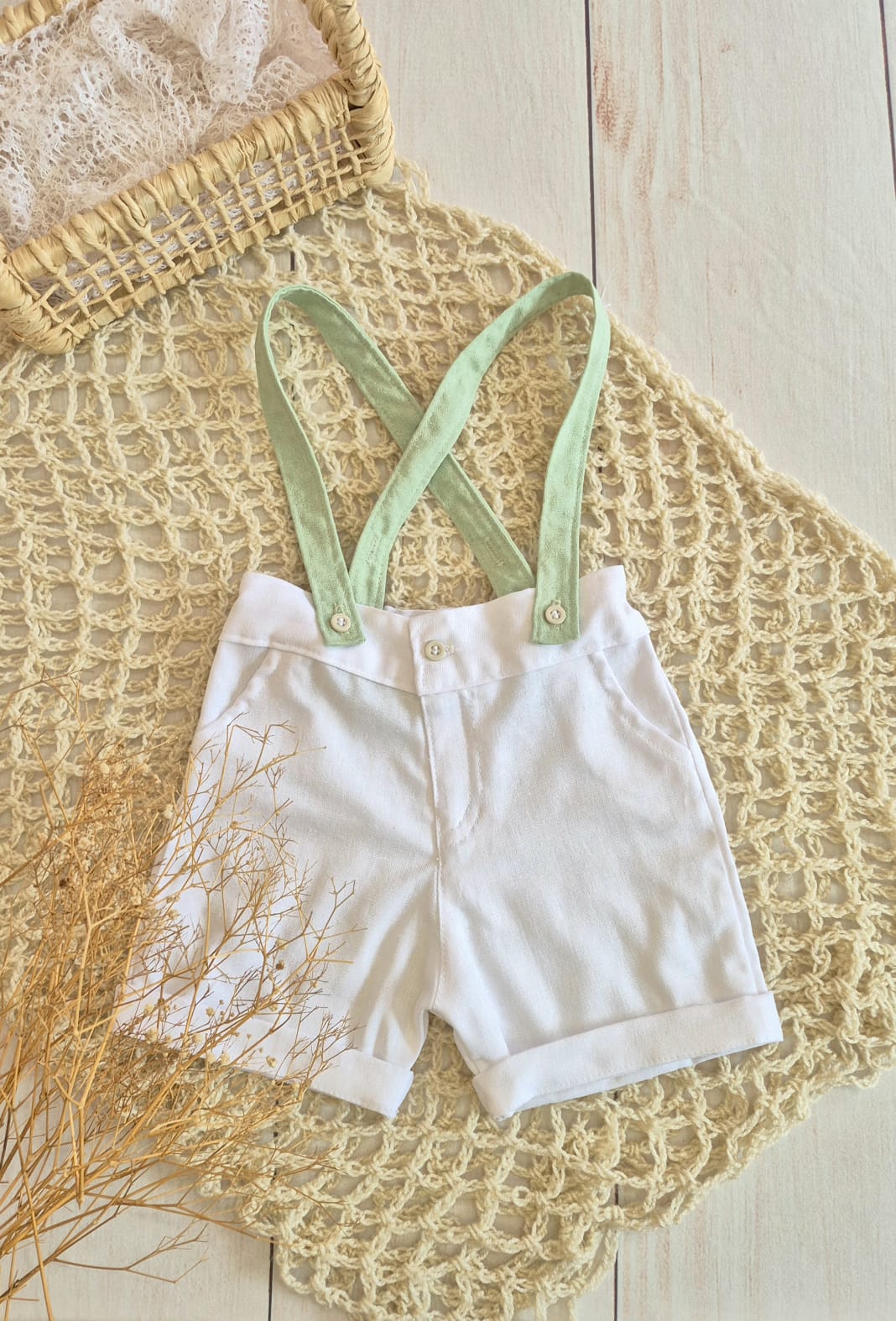 A bermuda e os suspensórios são confeccionados em linho misto, com elástico no acabamento da cintura e regulagem, o que ajuda no ajuste ao corpo, os bolsos frontais são reais.