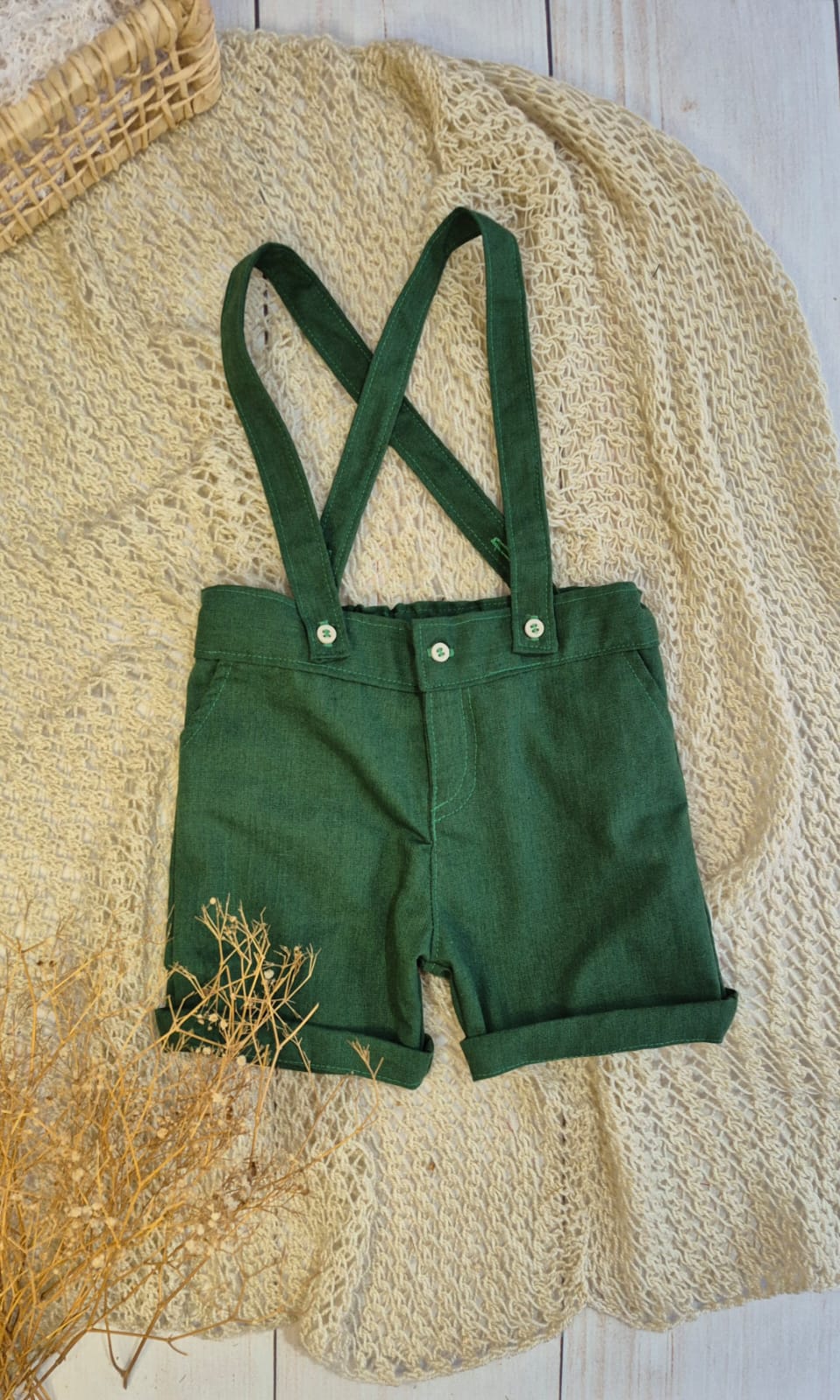 A bermuda e os suspensórios são confeccionados em linho, com elástico no acabamento da cintura e regulagem, o que ajuda no ajuste ao corpo, os bolsos frontais são reais.