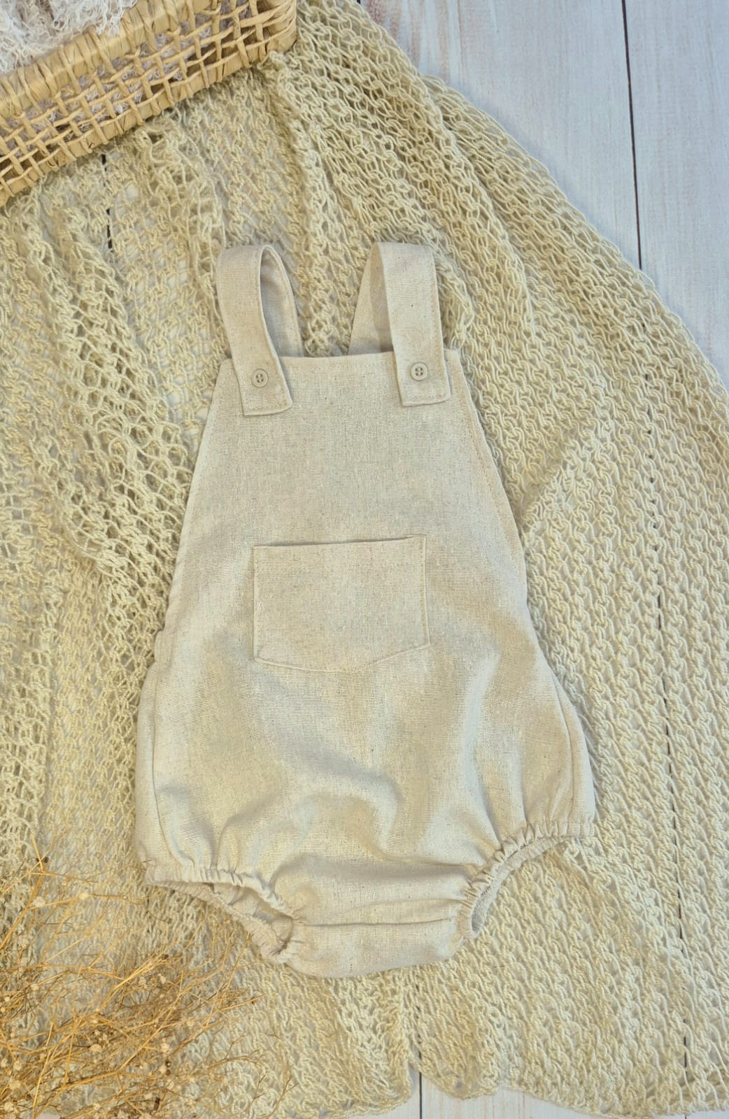 Romper confeccionado em linho misto natural.