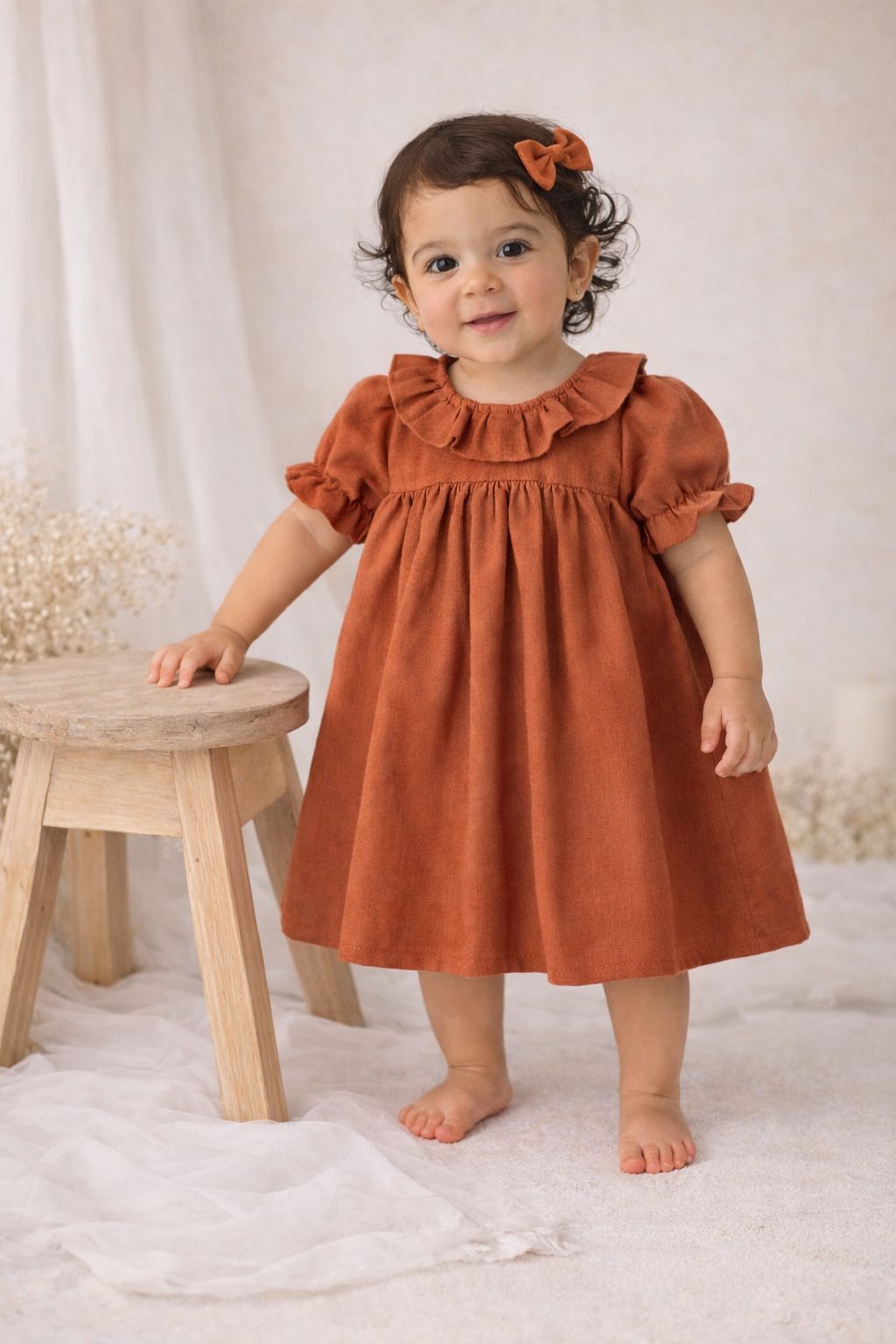 O Vestido Julieta é confeccionado em linho misto terracota, com detahe em babado na gola, botões e manga curta com acabamento em elástico.