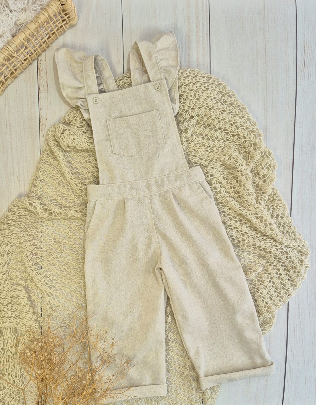 A jardineira Charlotte longa é confeccionada em linho misto natural, com detalhe em babado nas alças.
